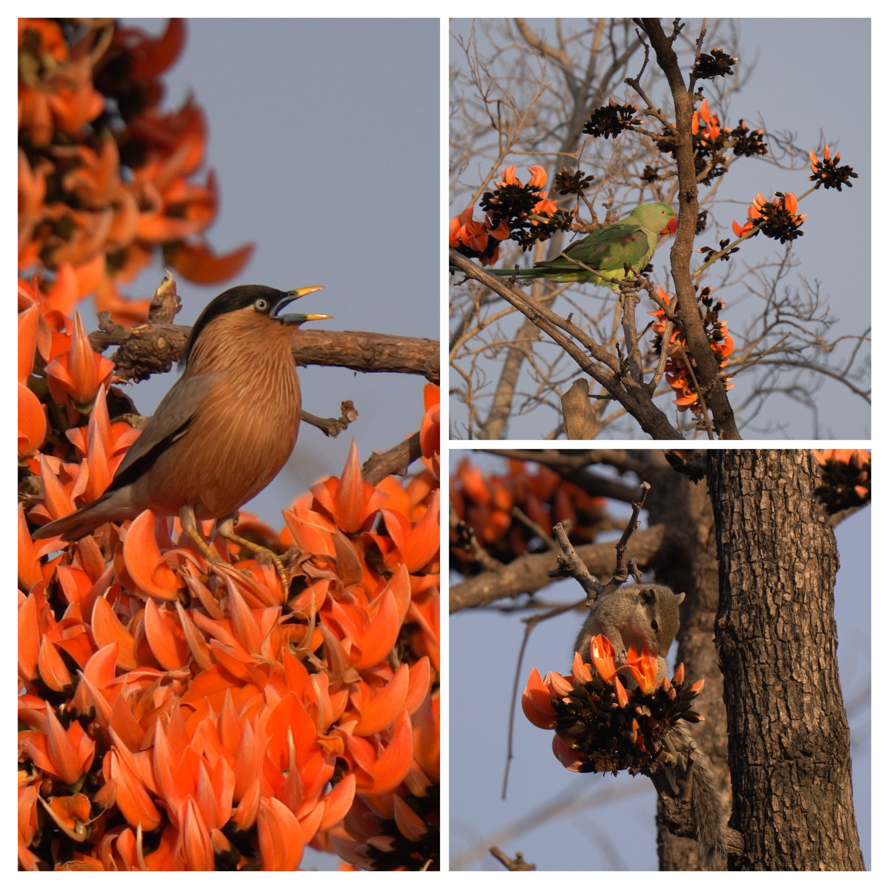 प्रतिदिन भोरकाल में सर्द चांदनी रात में धरा पर आए निशाजल की बूंदों के फूलों में सिमट जाने से बने अमृततुल्य मकरंद लेनें के लिए होड़ सी मच जाती है कही तितलियां तो कहीं भंवरे… शकरखोरे भी पीछे नहीं रहते अपनी लंबी सी चोंच लेकर वो भी पराग को खींचते है , सुबह की गुलाबी धूप में चमकती टहनियों पर मटक कर अपना अधिकार जमाती मैना, फूलों को खाकर शोर मचाते तोते, काली टोपी धारण कर पीले रंग में चमकते पीलक, मेरे पुष्प के साथ रंग मिलाते नर मिनिवेट, नीले – गुलाबी रंगों को दिखा कलाबाजियां दिखाते रोलर , श्याम वर्ण की चमक को अपनी जादुई पुच्छ से स्थापित करते रैकेट टेल्ड ड्रोंगों, द्विरंगी आभा के साथ तान छेड़ते टुइयां, , नील हरित रंग में रंगे पतरिंगे कहीं ऊंचे पेड़ो पर आराम करती “नन्ही” गिलहरीयां….